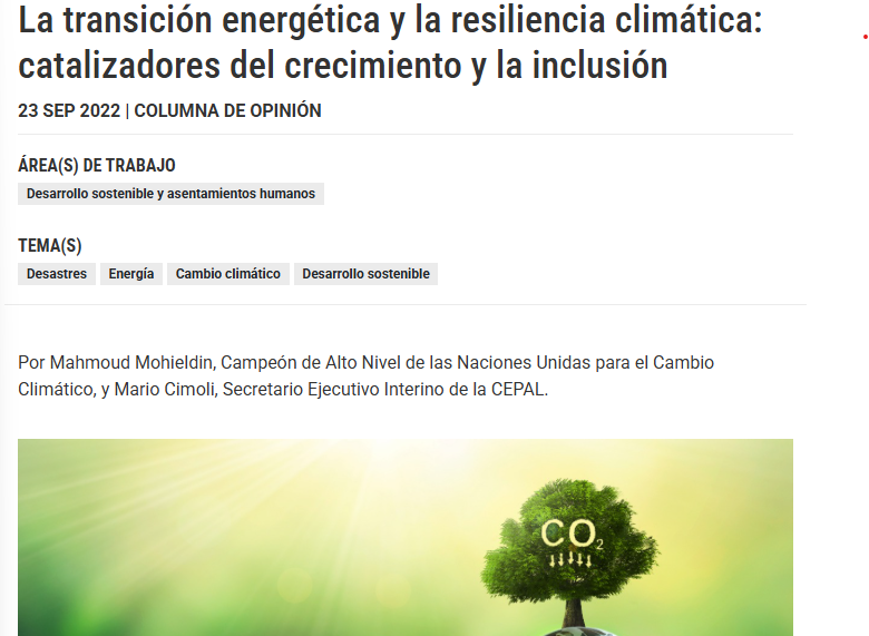 Opinion column by Mario Cimoli (ECLAC) and Mahmoud Mohieldin (UN High-Level Climate Champion) arguing that the energy transition and climate resilience are necessary conditions for renewing inclusive growth in Latin America and the Caribbean. It notes that the region, despite contributing a minimal share of global emissions, faces high climate vulnerability, growing public debt burdens, and lagging investment. It highlights the region's endowment of strategic resources for the transition (lithium, copper, solar and wind energy), the need for innovative financial instruments — debt-for-climate swaps, natural disaster clauses, a Caribbean Resilience Fund — and the link between fossil fuel price volatility and food price increases. Written in preparation for COP27.